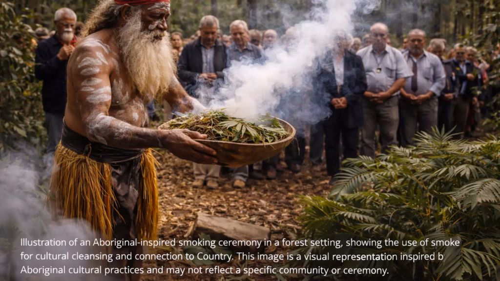 A smoking ceremony uses the smoke from smouldering native plants to cleanse people and place. It is led by an Aboriginal Elder or Knowledge Holder from the Country on which the ceremony is taking place, and what happens inside it varies significantly between language groups and regions. Some ceremonies run a few minutes. Others involve song, language, or protocols that belong only to the Elder conducting them.