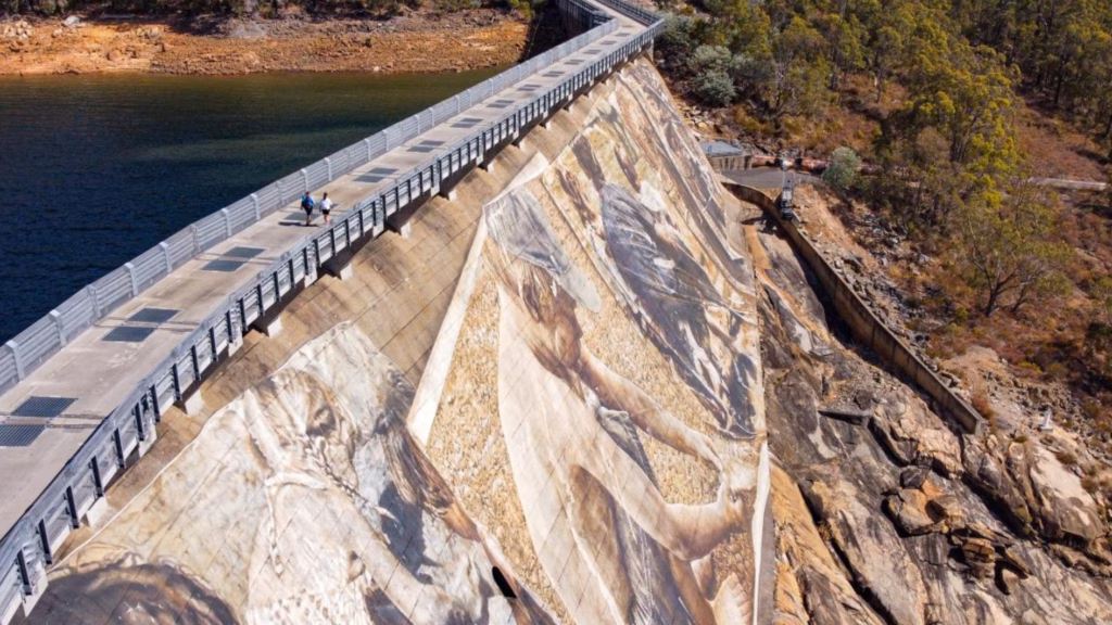 The mural on the dam wall was painted by Australian artist Guido van Helten and completed in February 2021 as the centrepiece of the $1.5 million Collie Mural Trail. At roughly 8,000 square metres it is considered one of the largest dam murals in the world.